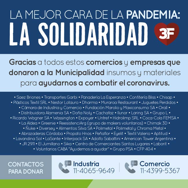 Ante emergencia sanitaria provocada por el coronavirus, se manifestó el espíritu solidario que tenemos los argentinos para ayudarnos mutuamente a sobrellevar distintas situaciones. Así, empresas, instituciones, PyMEs y comercios de Tres de Febrero donaron insumos y materiales a la municipalidad para sostener las acciones contral coronavirus. Si querés colaborar, podés hacerlo llamando al 11-4065-9649 o al 11-4399-5367.