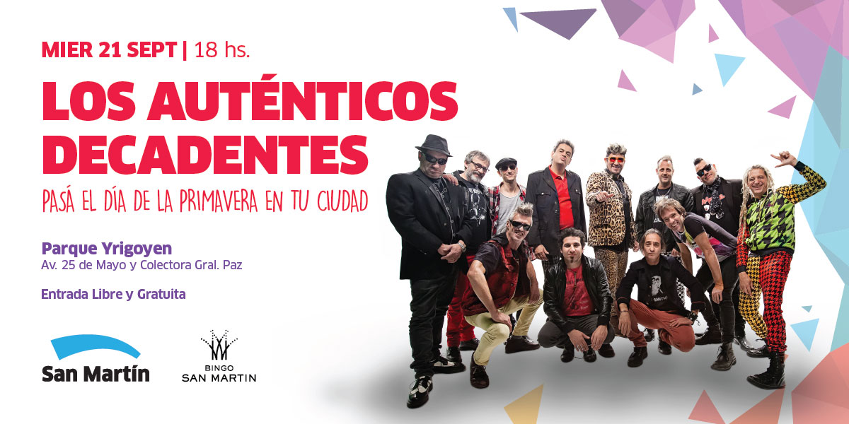 Para festejar el día de la Primavera, el miércoles 21 de septiembre, la legendaria banda de rock argentino Los Auténticos Decadentes brindará un recital gratuito, organizado por el Municipio de San Martín, en el Parque Yrigoyen -25 de Mayo y Gral. Paz-.